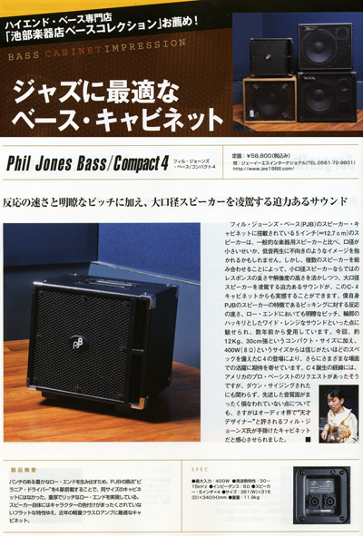 このジャズライフ誌に渋谷のハイエンド・ベース専門店「Bass Collection」がお薦めする「ジャズに最適なベース・キャビネット」という特集でPJBの新製品で小型ベース用キャビネットのC-4 (Compact 4)が紹介されたのでご紹介させてもらいます。C-4は5″のPJBピラニアスピーカーを4個搭載の最新小型ベースキャビネットです。定価:¥58,800・本体価格¥56,000。(詳しくは下の写真クリックでpdf)