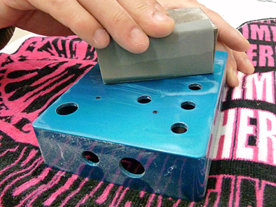 そうです!塗装、研磨、バフなど、ギターと全く同じ工程で、意図しているのは真っ平な表面でまさに鏡のような鏡面仕上。非常に美しいカラーです。ステージのライティングを受けている時は鮮やかなブルー、暗いステージではグリーンに見えます。この後はシルクスクリーンがのり回路を組み込んで完成となります。次回お伝えする時は最終完成形の外観をお見せすることができると思います。