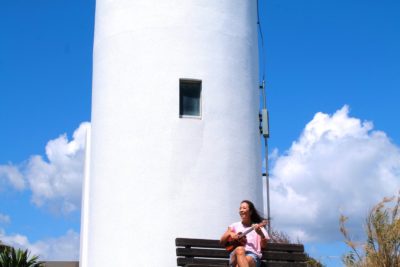 快晴の和歌山県太地町の海岸で気持ちよさそうにKUMUウクレレを弾いているのはKUMU AmbassadorのSlataさんとChiharuさん。