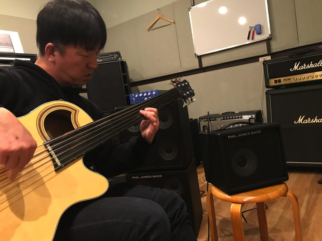 エレキベースで試奏は当たり前ですが、 今回は僕のもう一つのスタイルになりつつあるアコースティックベースでも 試奏をしました。