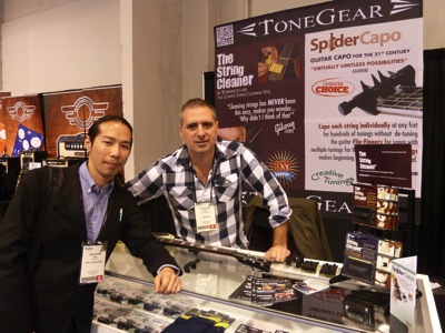 ギターのケア製品に特化した製品を続々と発表するTone Gear。写真はTomoとTone GearのDave。最もポピュラーで代表的な製品である“String Cleaner”ストリングクリーナーは彼らの商標となっています。