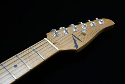通常よりやや太めのネックはオーブンで軽く焼いたキャラメルメイプル仕上げ。水分が適度に抜け気候に左右されにくい丈夫なネックとなります。ネックの芯までビンテージルックの飴色カラーとなりますが、サウンドは意外にも新品のメイプルと比べあまり変わらないとのこと。