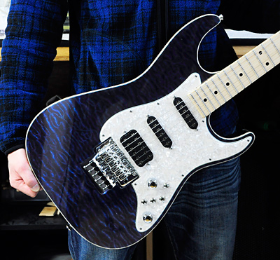 Quilted Maple Top on Basswood, Hard Rock Maple & Neck, Satin Finish, 1 11/16″ in Nut, Heavy frets, Even Taper, Bozz Feiten Tuning System, Chrome Sunken Floyd Rose, Split Shaft, SA1R SA1 H2+. White Pearloid Pickguard, Switheroo, .009-.042 Elixir Strings.