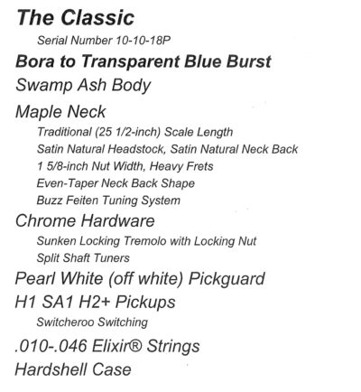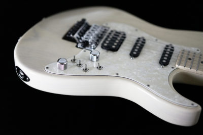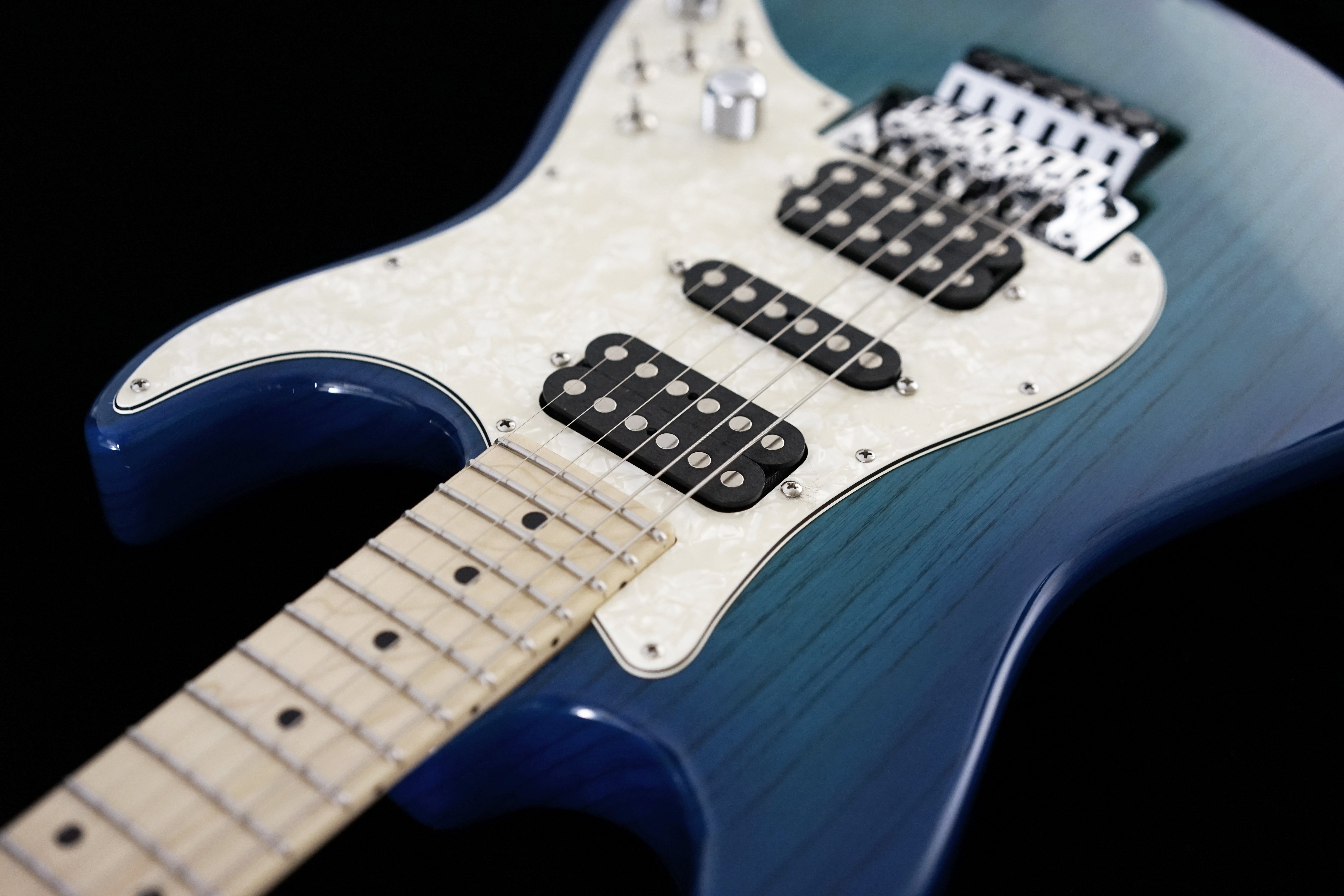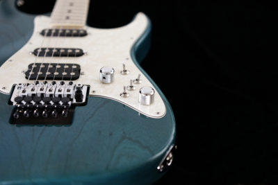 Bora Bora BlueにボディエッジがTrans BlueのBurst。ナット幅は細身の1 5/8″(41.28mm)。今回入荷の3モデルに共通するのはSchaller製のFloyd Roseタイプ。FR時代の時と比べ上質な材でサビや摩耗に強く、ファインチューニングも滑らかに調整ができ、より信頼性が高まりました。