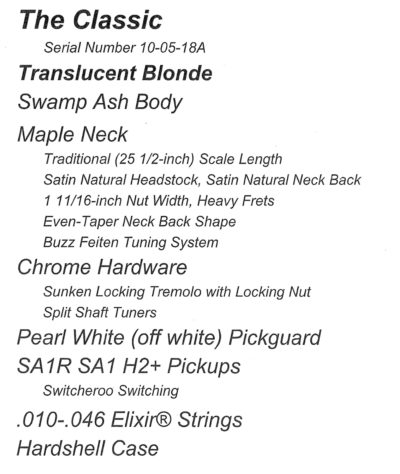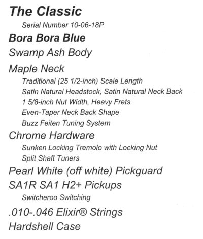 ご覧のようにやや暗めのライティングではダークブルー。明るくなるにつれグリーンっぽく見えます。ボディはSwamp Ash。コントロールは全ピックアップの組み合わせをキャンセルしてリアハムに瞬時に切替るBlowerスイッチがついたSwitcherooシステム。