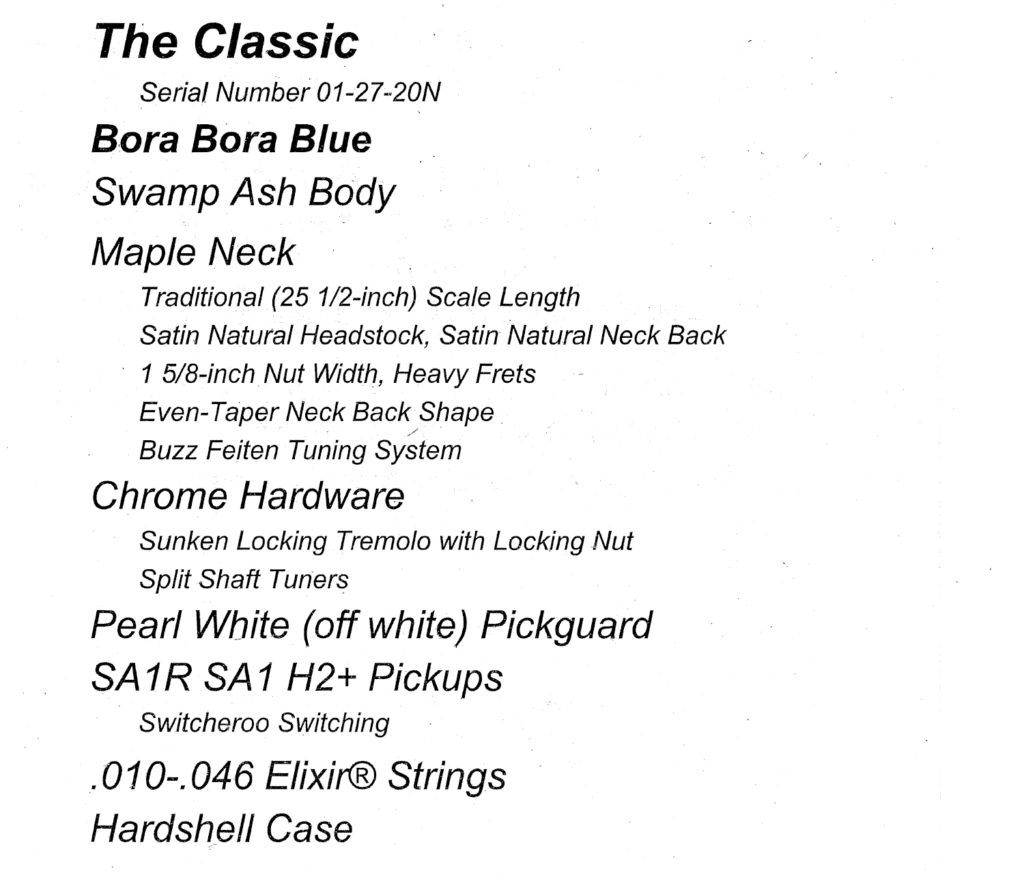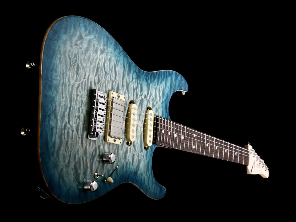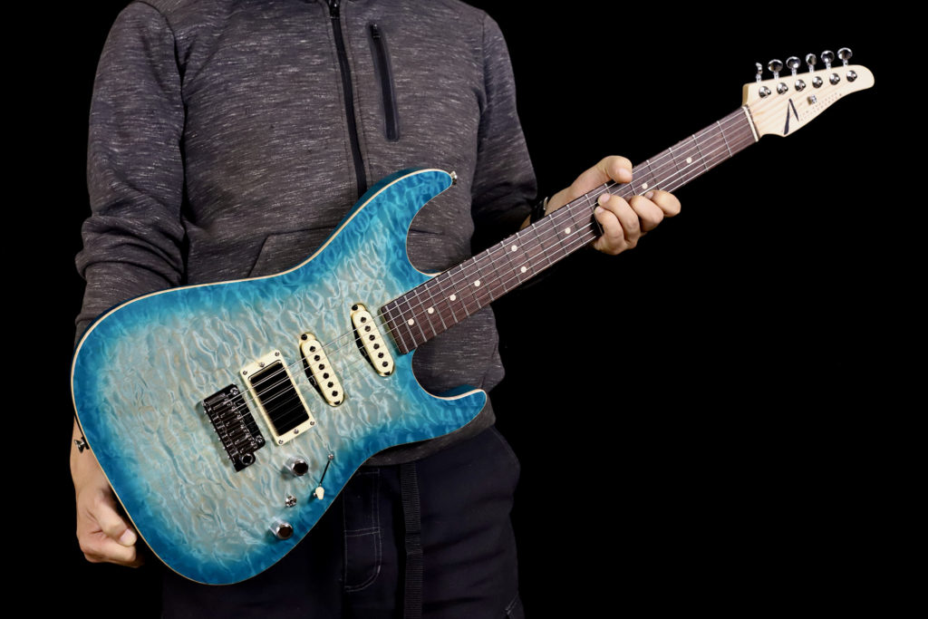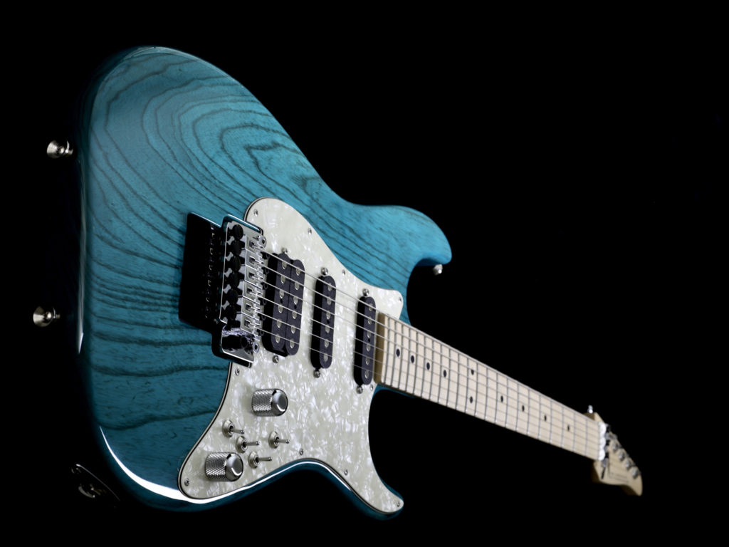 The CLASSIC, ステージライティングによって、ブルーやグリーンに見えるBora Bora Blueは、ボラボラ島の透き通った海の色をイメージしたもの。スイッチルーシステムで、3つのPUのあらゆるコンビネーションが可能。