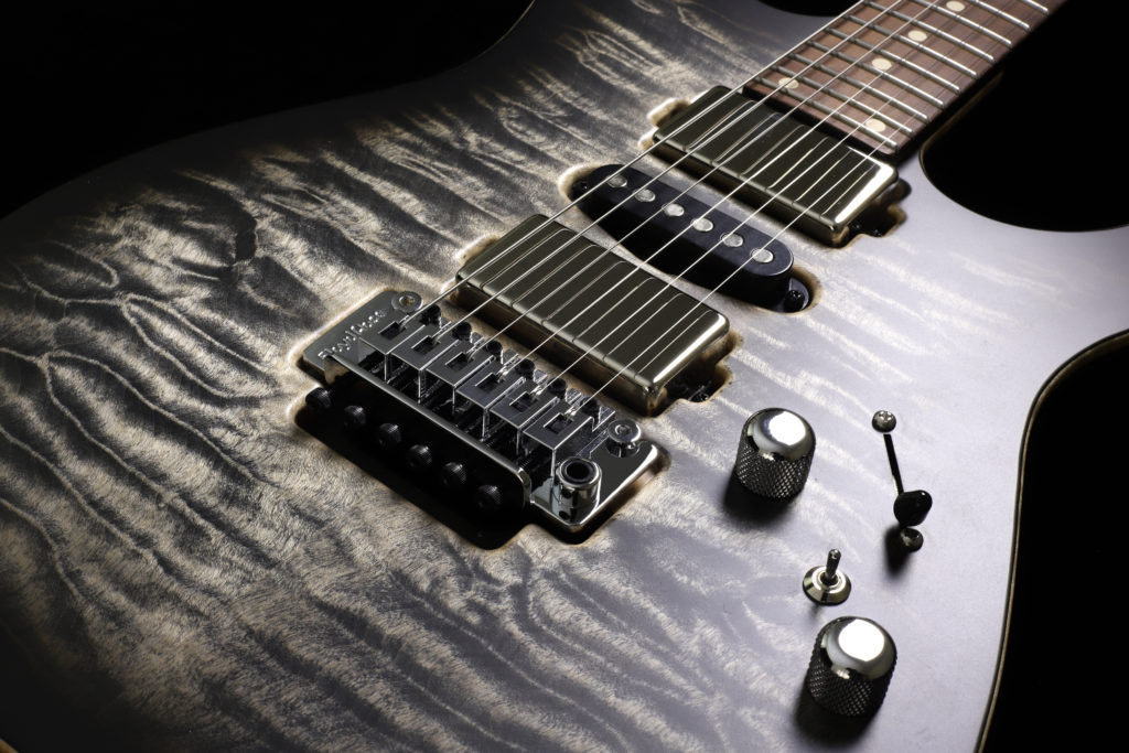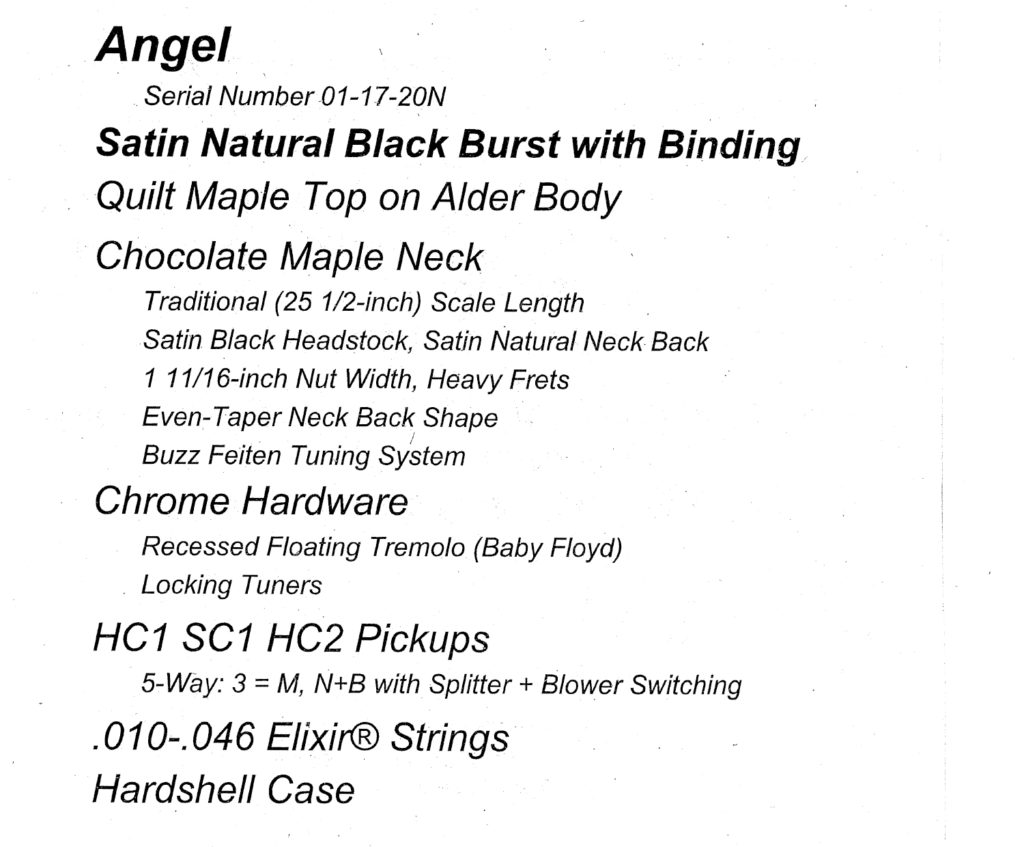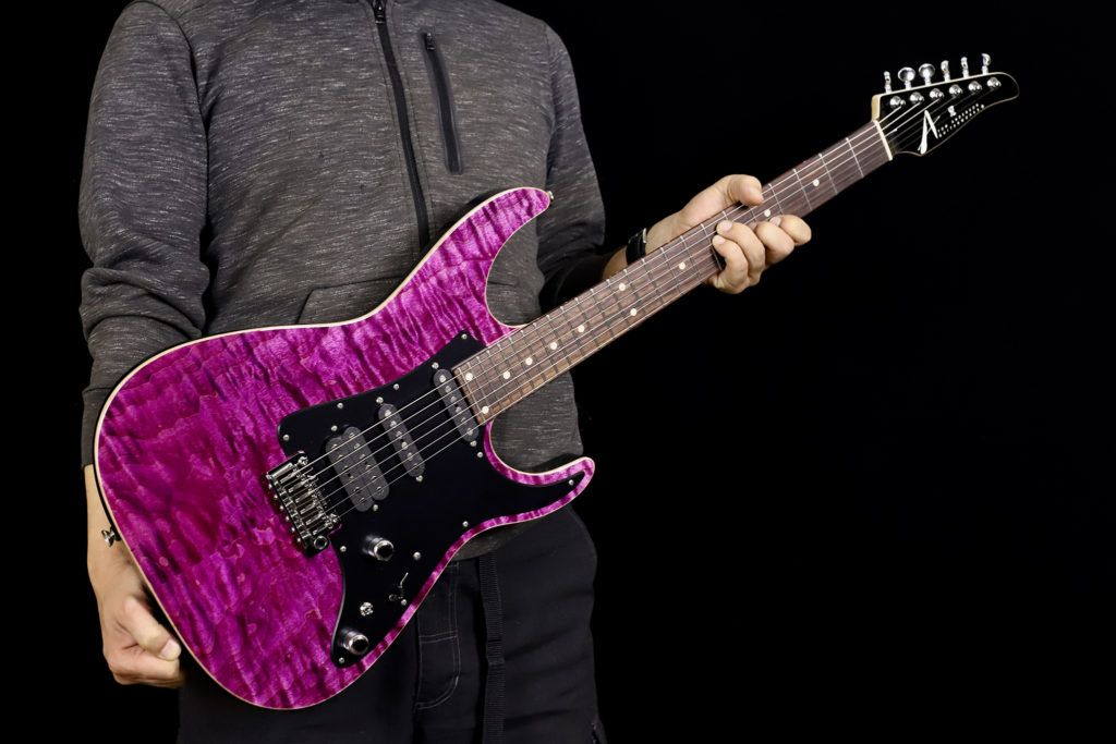 モデル名は、24フレット、25 1/2″スケール仕様が特徴のANGEL。シンプルに見えますが、HSHの重装備。5点スイッチのセンター位置で、Miniスイッチを使い瞬時にフロントとリアPUのハムモードに切替。Miniスイッチをさらにもう一段倒すと全てのPUセレクターをキャンセルしてリアハム1つのみになるソロギターモード。