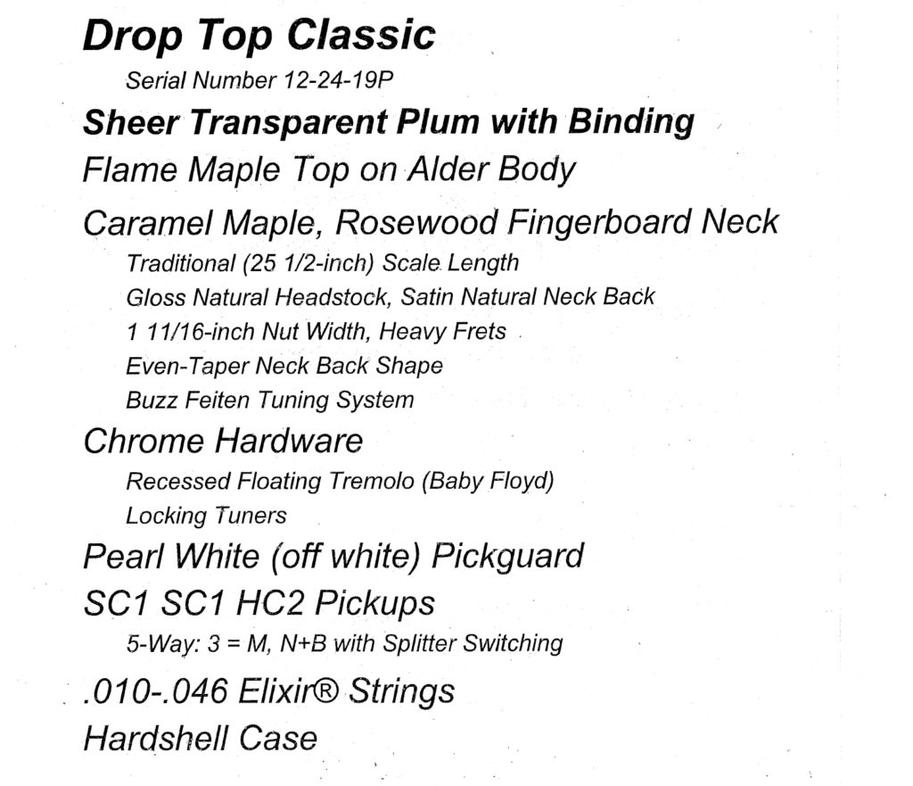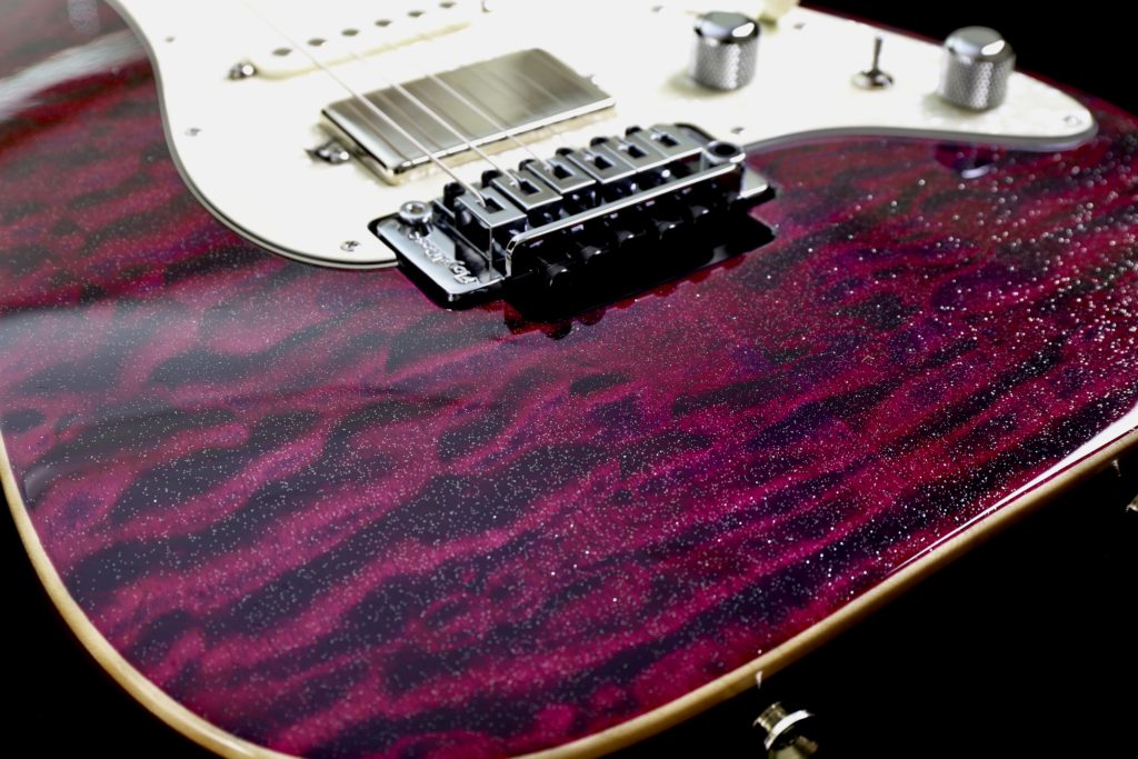 通常のSheer(シアー)系と比べややシルバーフレイクが多めのこのモデルはDROP TOP CLASSIC, Sheer Trans Plum。ステージでのライティング映えを意識したカラーフィニッシュ。1本1本カスタム製作をしているTom Andersonならではの特別仕様とも言えるでしょう。