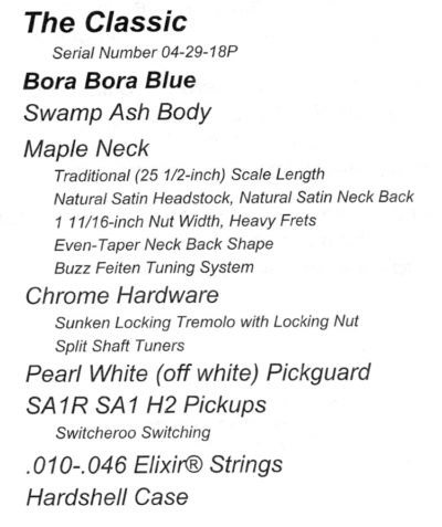 Tom Andersonの中で最も認知度の高いモデル。全く同じように思える今回入荷の2本も微妙な違いが。1本はやや幅広のナット幅1 11/16″(42.86mm)とSA1 SA1R H2。もう1本は、ナット幅1 5/8″ (41.28mm)にSA1 SA1R H2+。同じBora Bora BlueでもSwamp Ashの素材の持つ自然な色により、着色後のカラーはやや薄め〜やや濃い目と変化があります。