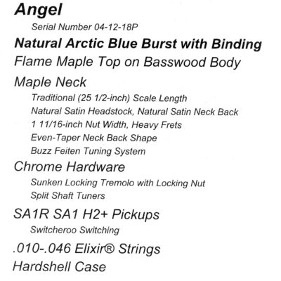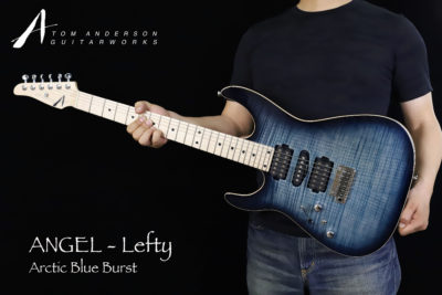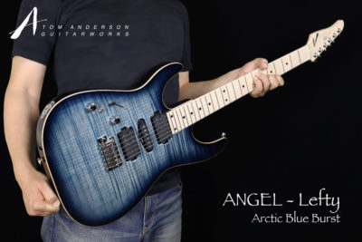 まずはこちら、Arctic Blue Burstです。モデルは24フレット仕様のAngel。そして久しぶりのLeftyモデル。