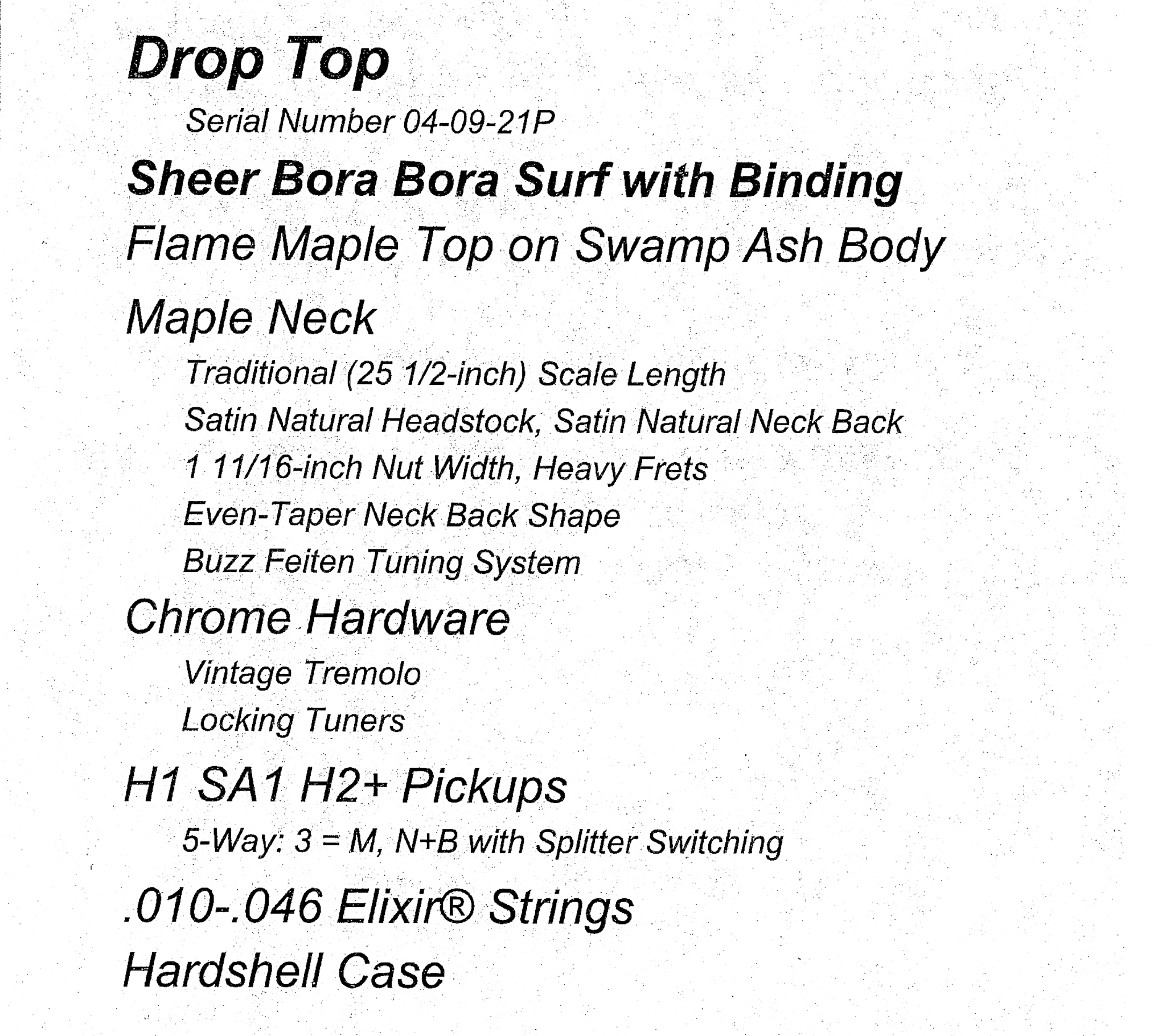 Guardian ANGEL、Cajun Red、Flame Maple on Basswood Body、41.28mmスケール(1-5/8″)、Even Taper Neck Back、Buzz Feiten Tuning System、Vintage Tremolo、Locking Tuner、Black Hardware、HシリーズハムとSAシリーズのスタックトハムシングルは従来よりのミッドレンジ押し出し感の強いPU。コントロールは5点スイッチにコイルタップミニスイッチ+ネックとブリッジPUのコンビネーションも使える、前述のDROP TOP. Sheer Bora Bora Blueを同じシステムを採用。激しく、スピード感のある音楽もテクニカルな描写が求められる音楽も… 速攻で臨戦態勢準備完了!