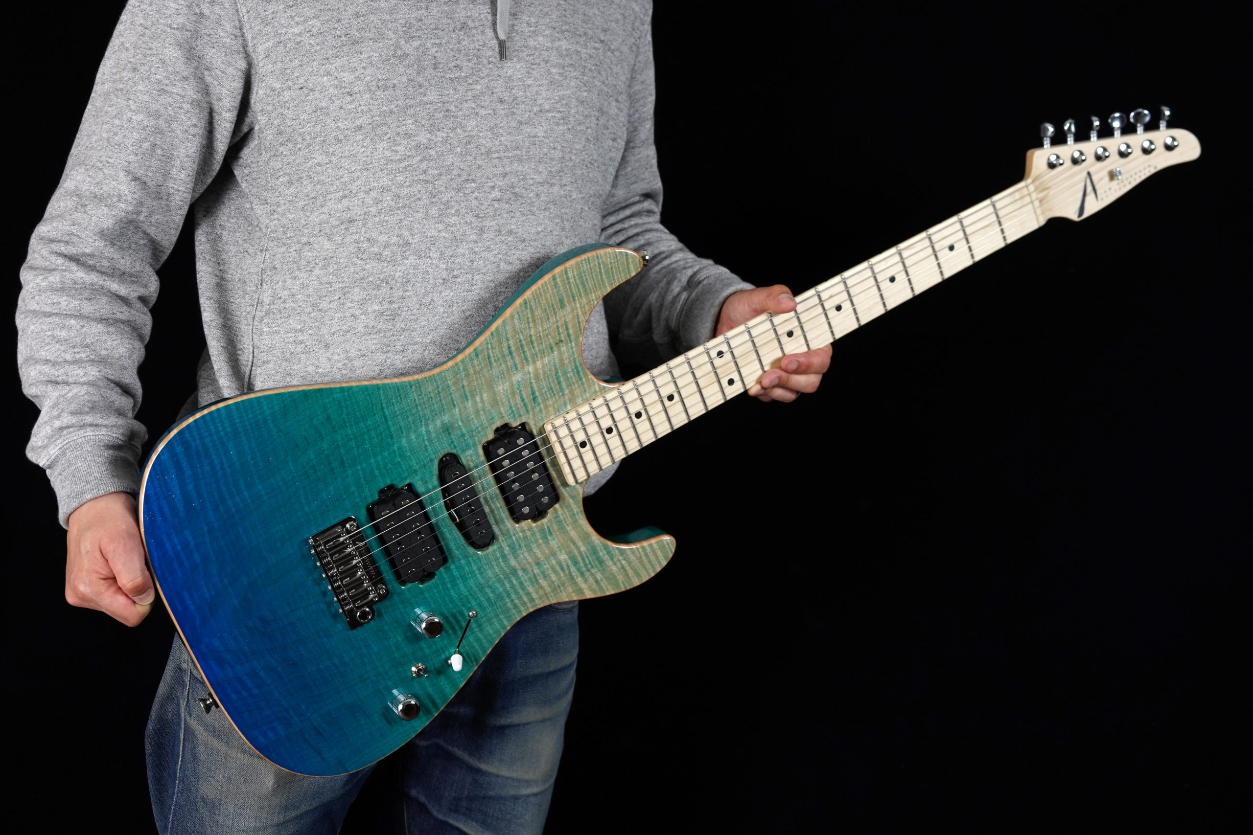 Arctic Blue Burst、Rosewood Neck、レンジ感が広くエフェクター乗りの良いHSHピックアップ、Tom Andersonのカスタムスイッチングシステム(今回入荷の他の2本と同じコントロール)など。いぶし銀のように光る、このギターの魅力はエンドレスです。