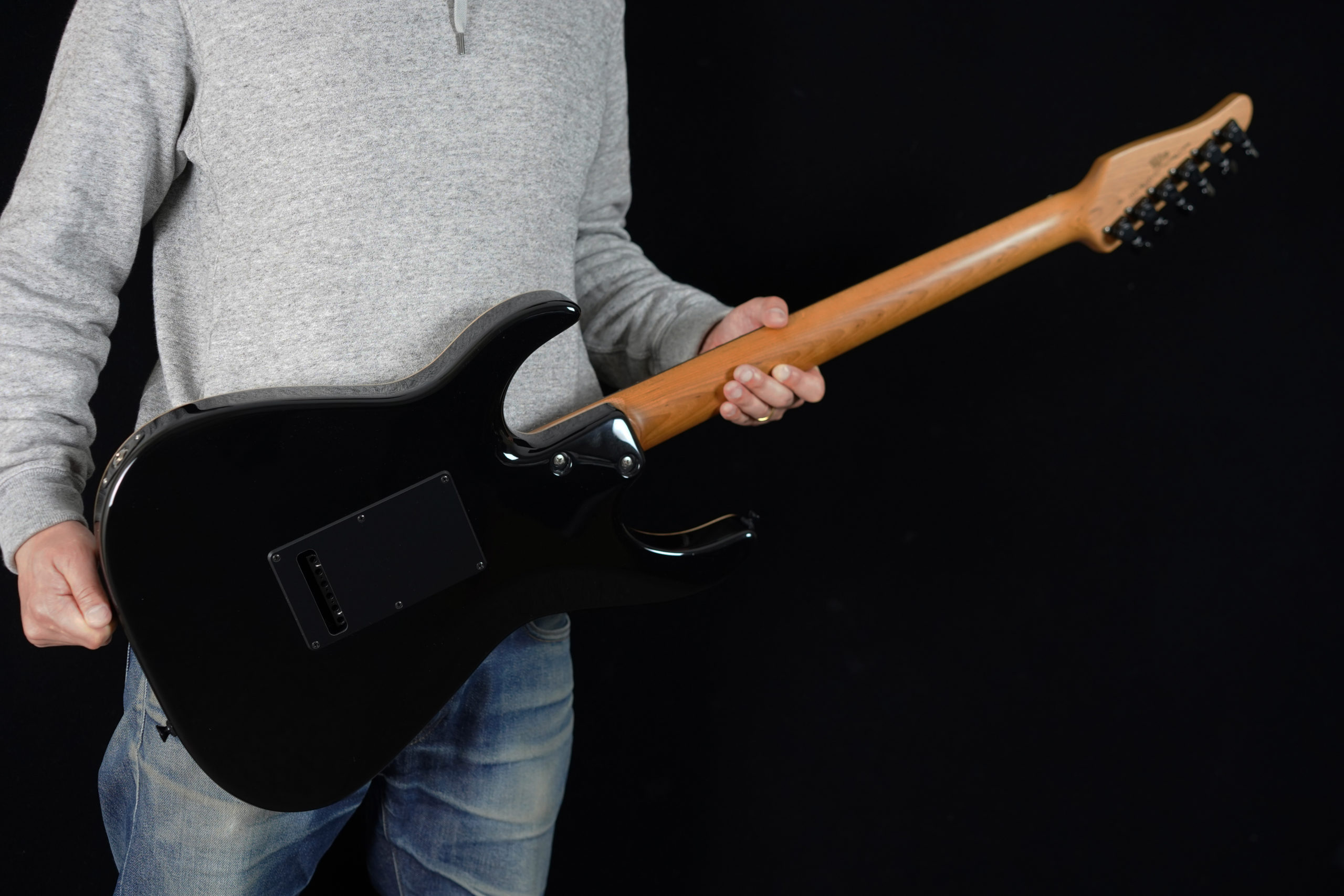 42.8mm(1-11/16″)のややワイドでしっかいとしたネック、Heavy Frets、Even Taper Neck Back Shape、Buzz Feiten Tuning System、Vintage Tremolo、Locking Tuners。サウンドの要のピックアップには、特にミッドレンジの押し出しの強いHシリーズハムとSAシリーズのハムキャンセルPUを使用。5点スイッチセンター時にToneプルでNeckとBridgeピックアップのコンビネーション、さらにミニスイッチでコイルスプリッター。見た目がシンプルなのにサウンドとトーンのバラエティとセレクションは守備範囲が相当広いです。