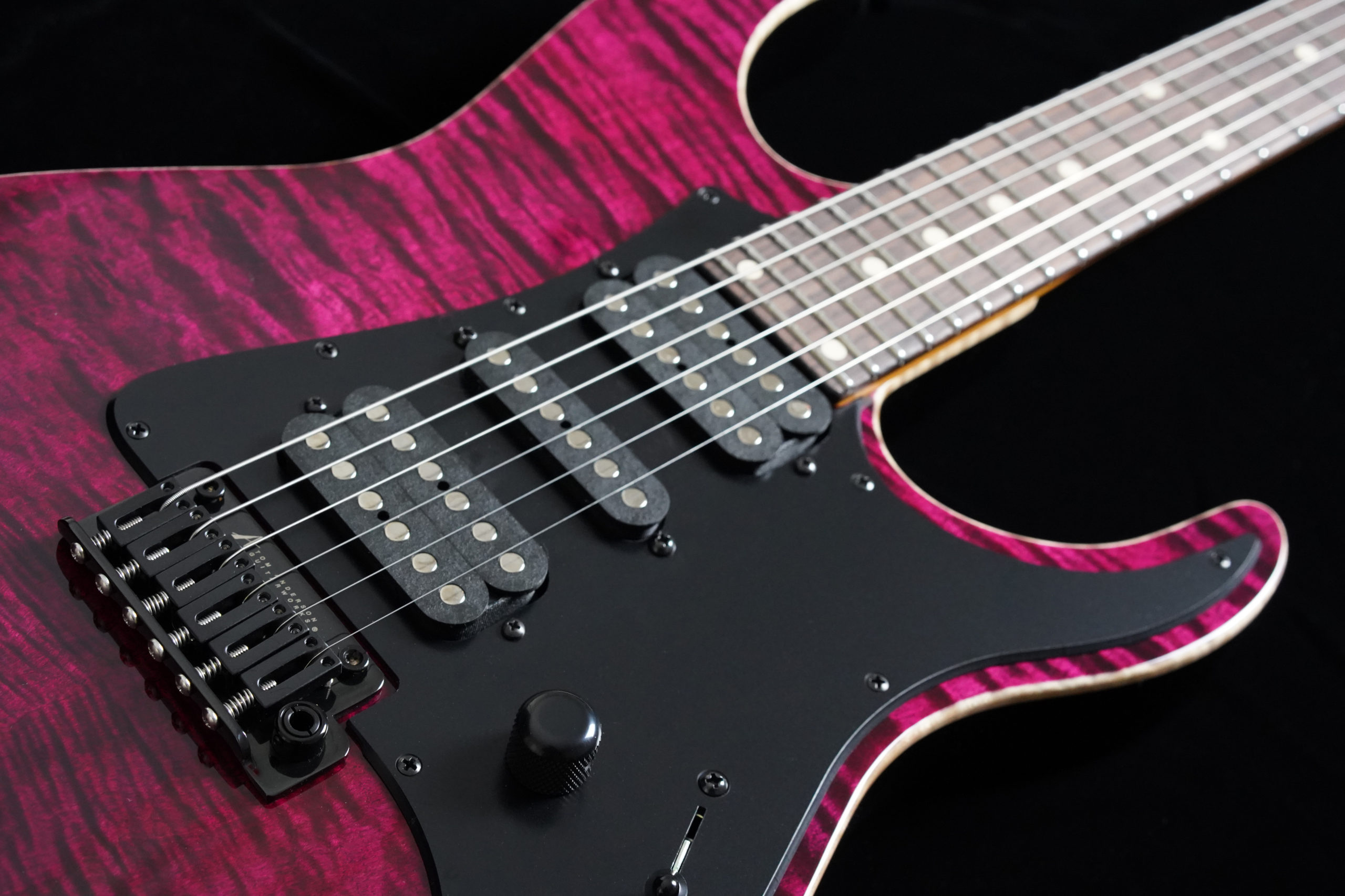鮮やかでディープな赤のこのフィニッシュはCajun Magenta。赤にピンクが混ざったような独特のカラーです。24フレット仕様のAngelをガードするようにピックガードが付いているのがGUARDIAN ANGEL。オーブンで熟成したビンテージギター風で飴色のメイプルネックにローズウッド指板、ボディはスローな熟成でセレクトされたイースタンバスウッド材。